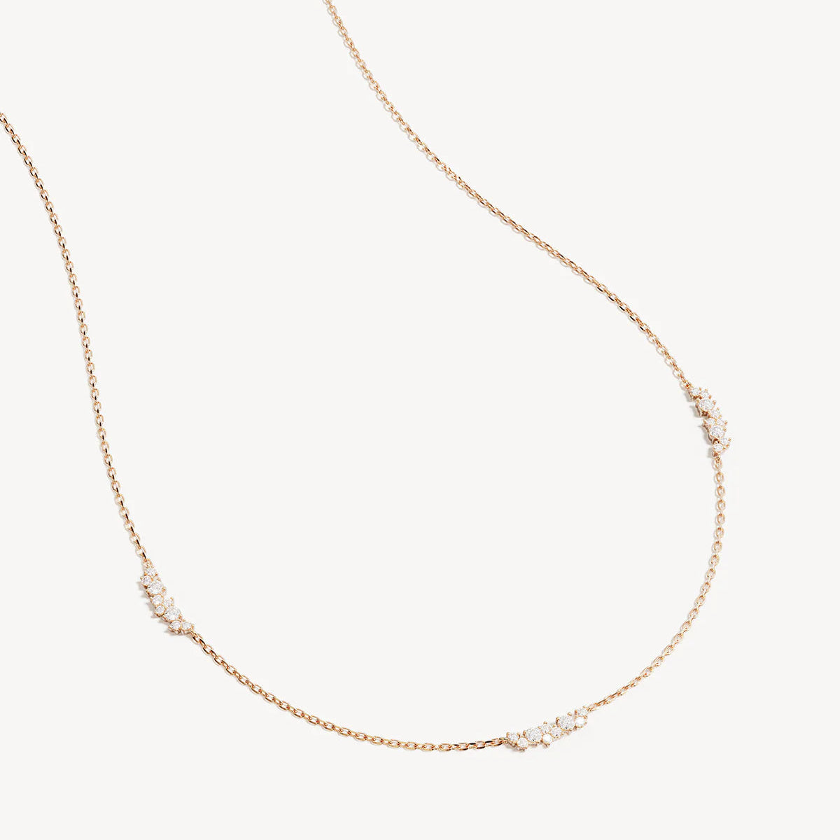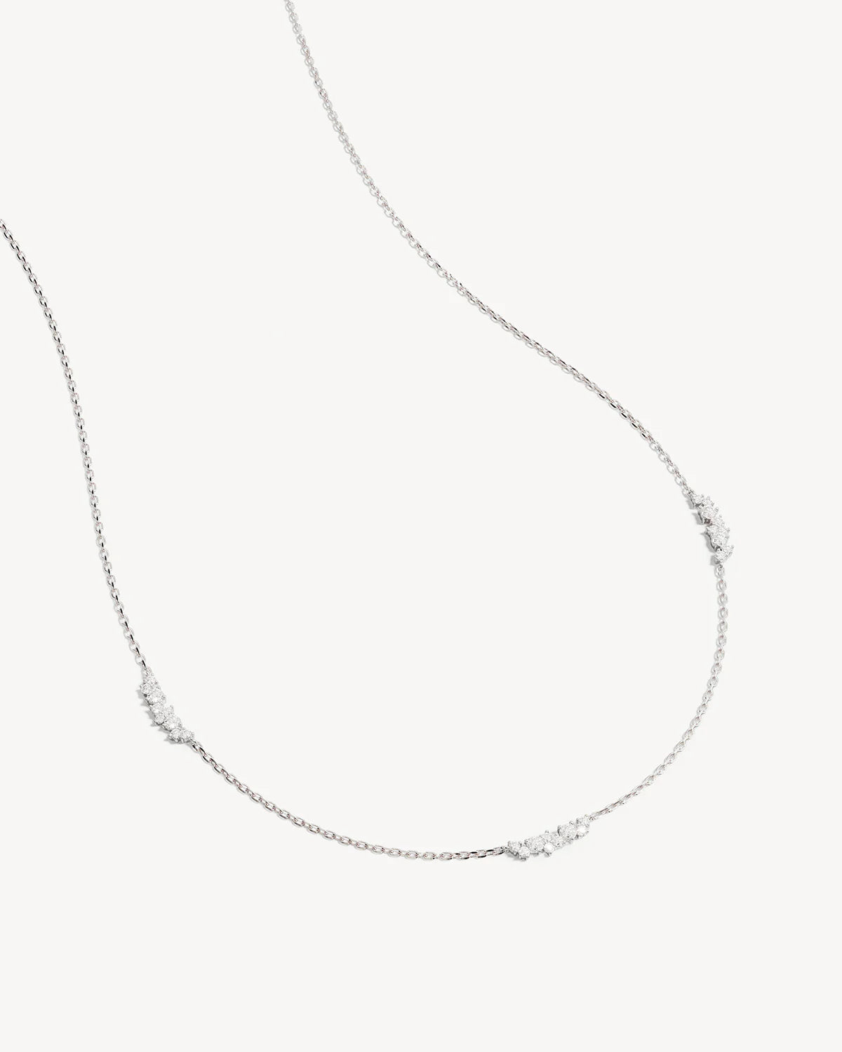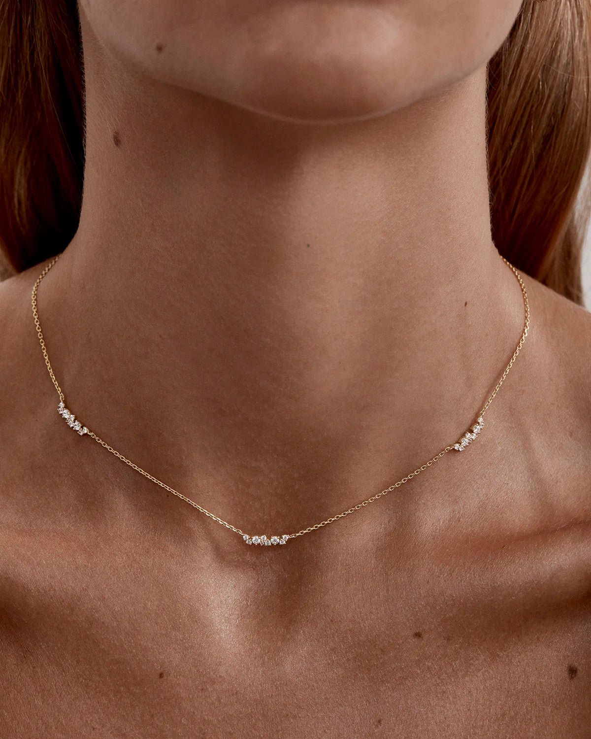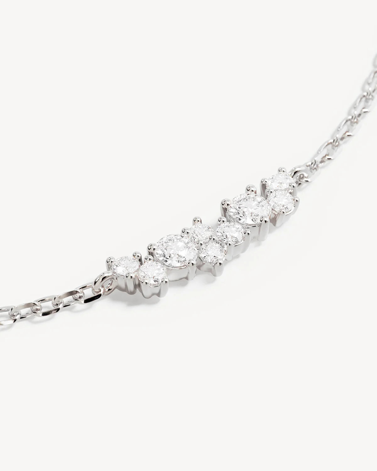 Delicate cluster design featuring varying sizes of cubic zirconias creating an undulating bar effect.